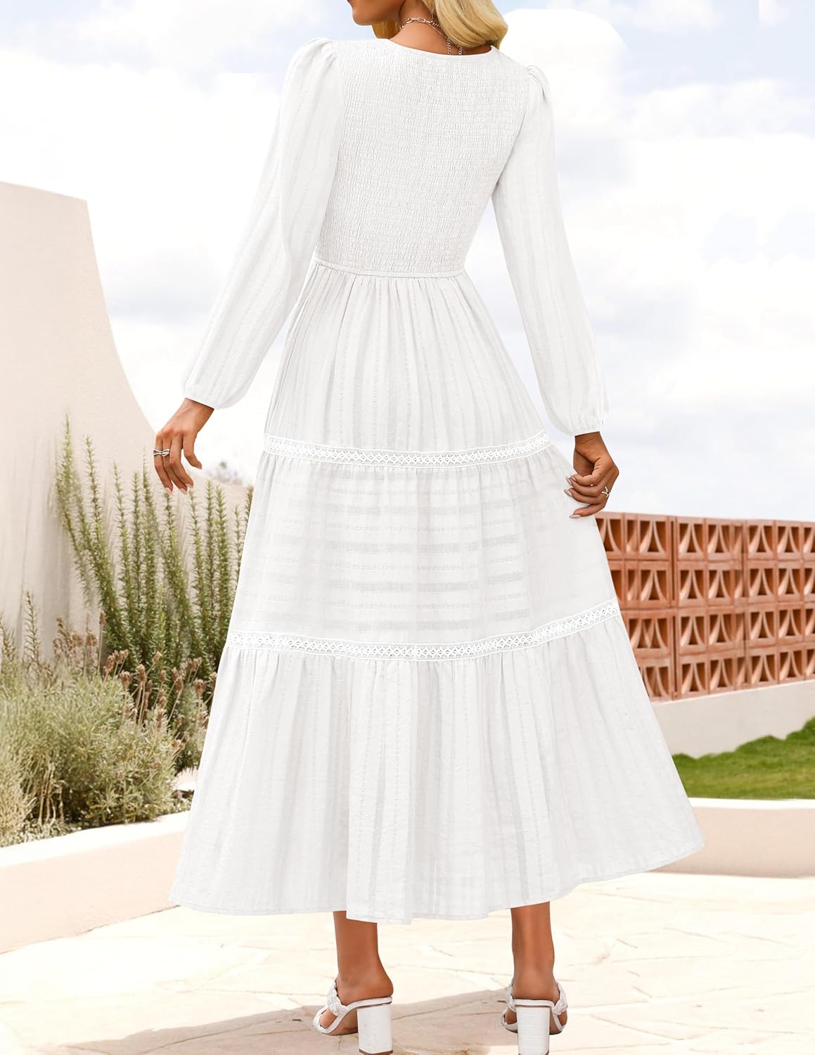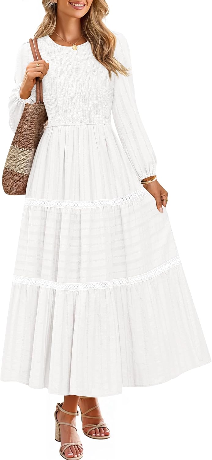 - Design: This elegant long dress features a classic crew neck and long sleeves, offering a sophisticated look. Its a-line silhouette gently flares from the elastic high waist, while tiered layers add flowy movement for feminine charm.