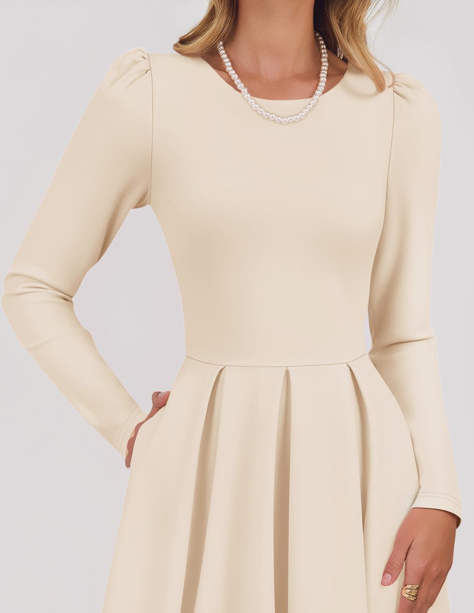 ZESICA Womens Long Sleeve Midi Dresses 2026 Fall Elegant Crewneck Swing A Line Wedding Guest Party Dress with Pockets