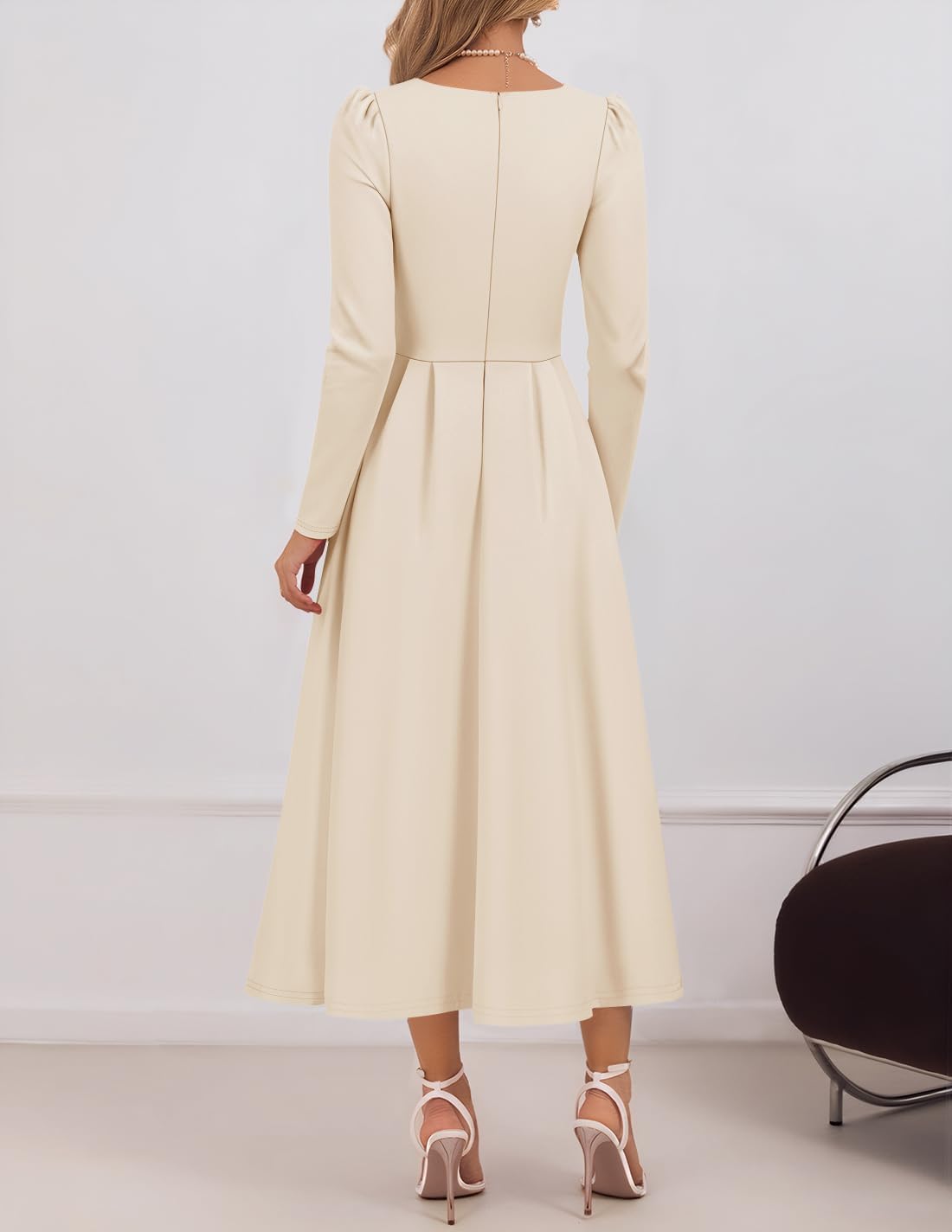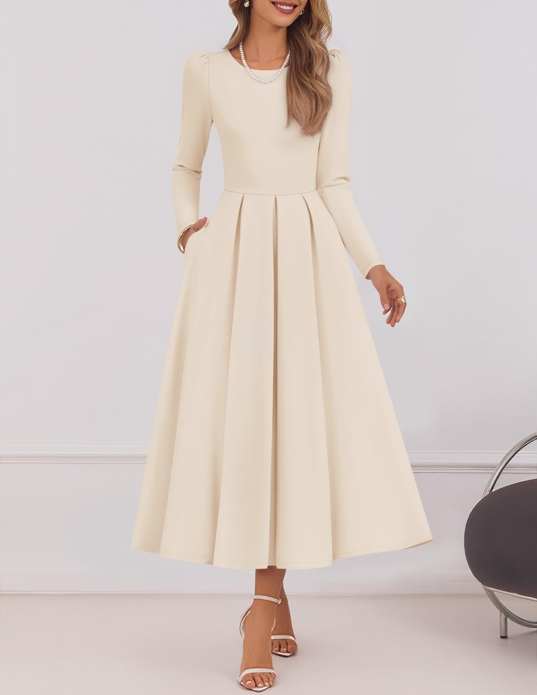 • Womens long sleeve dress features a classic crewneck, flattering silhouette, high waist, a line, two side pockets, back invisible zipper, swing skirt, and solid color design that transitions effortlessly from daytime events to evening events