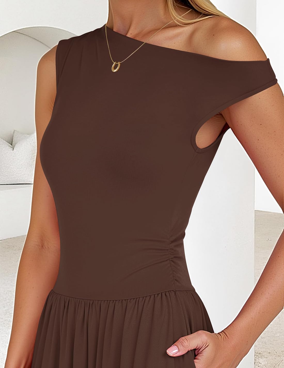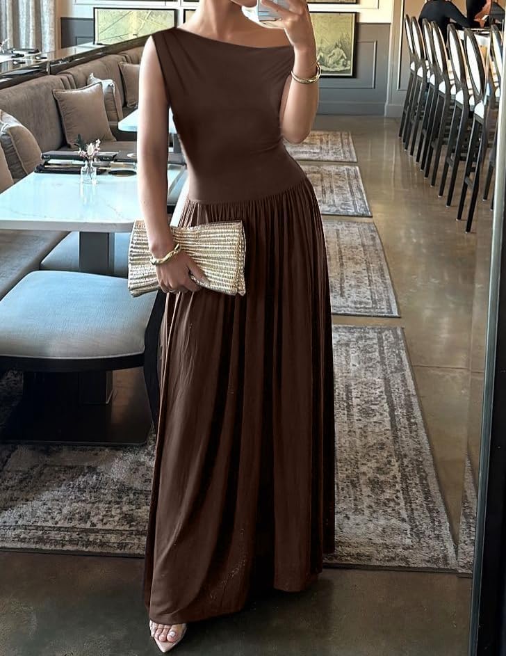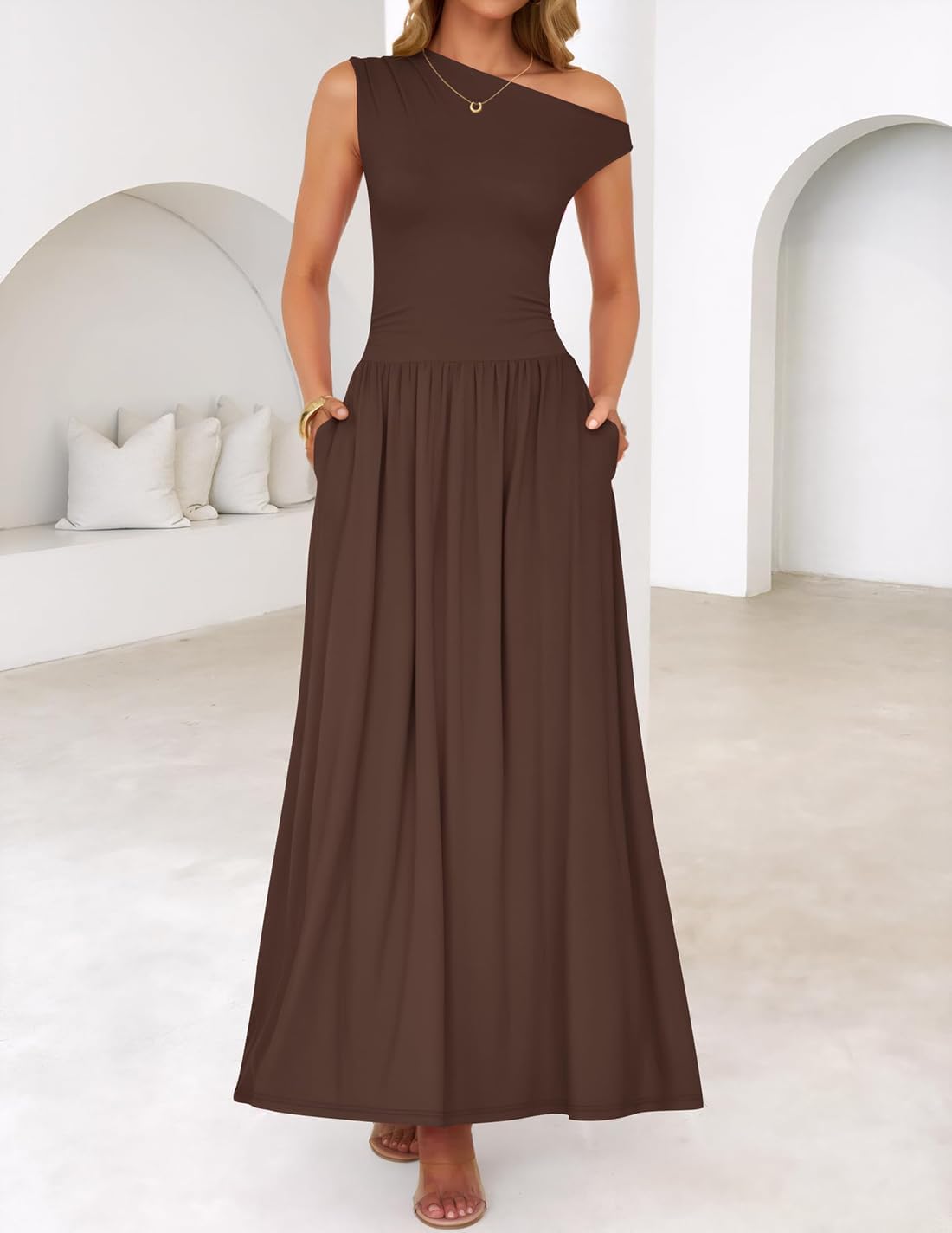 - Features: Casual dress, maxi dress, slim one shoulder, sleeveless dress, solid color, stretch, two side pockets, a-line style, pleated dress, swing flowy dress, formal dress, summer dress. A combination of sophistication and romance