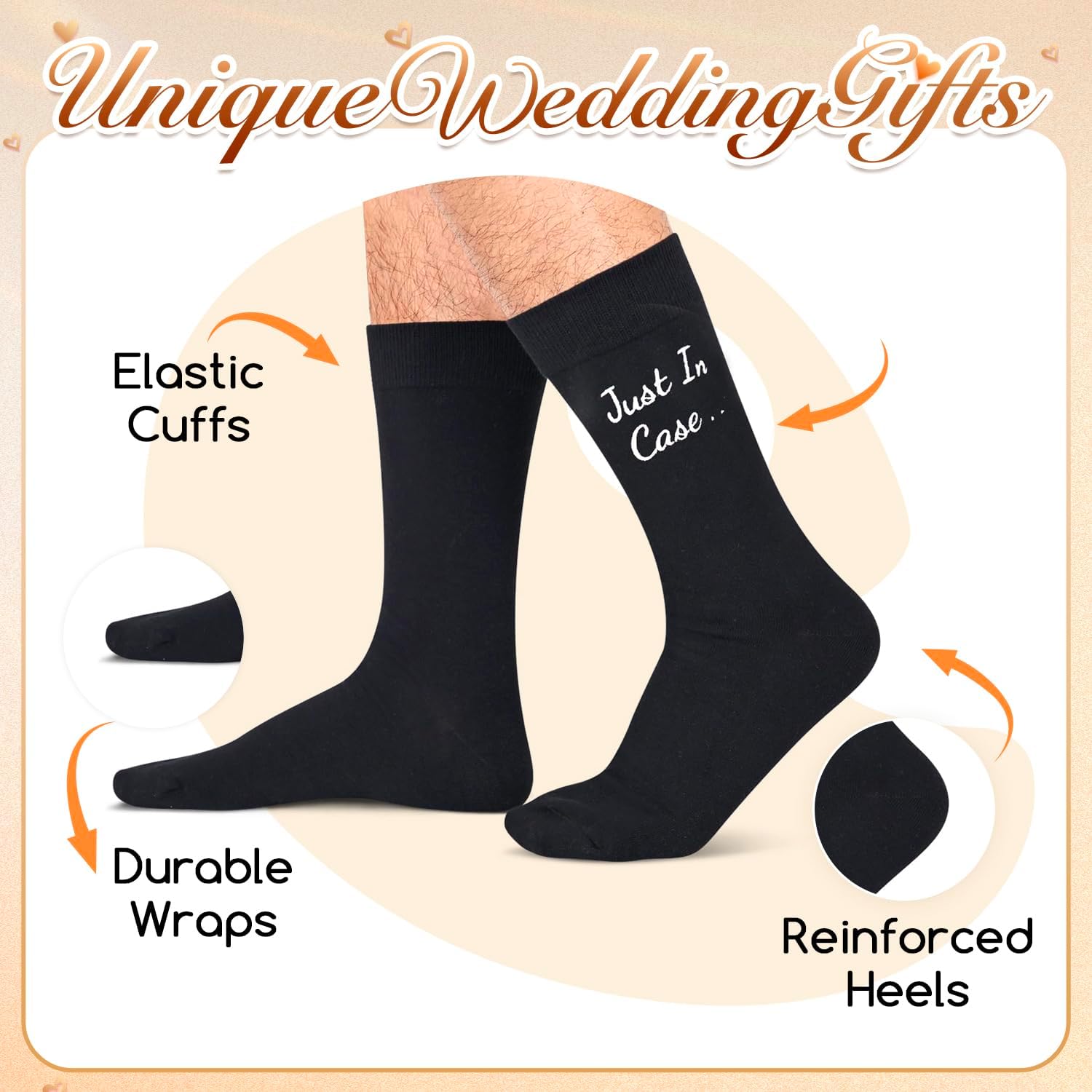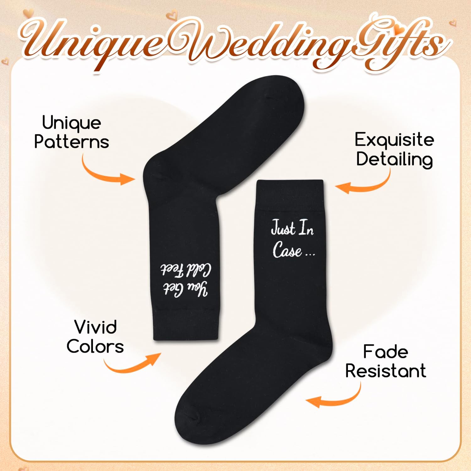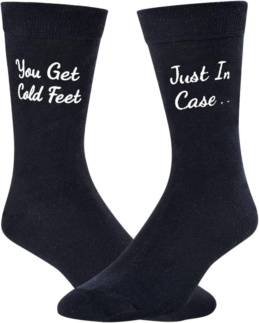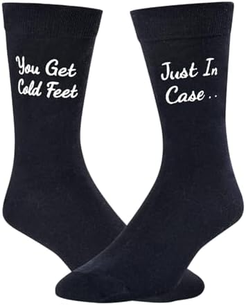 • GROOM SOCKS: These black funny wedding dress socks have the saying “JUST IN CASE YOU GET COLD FEET” inscribed on the side of this wedding socks.