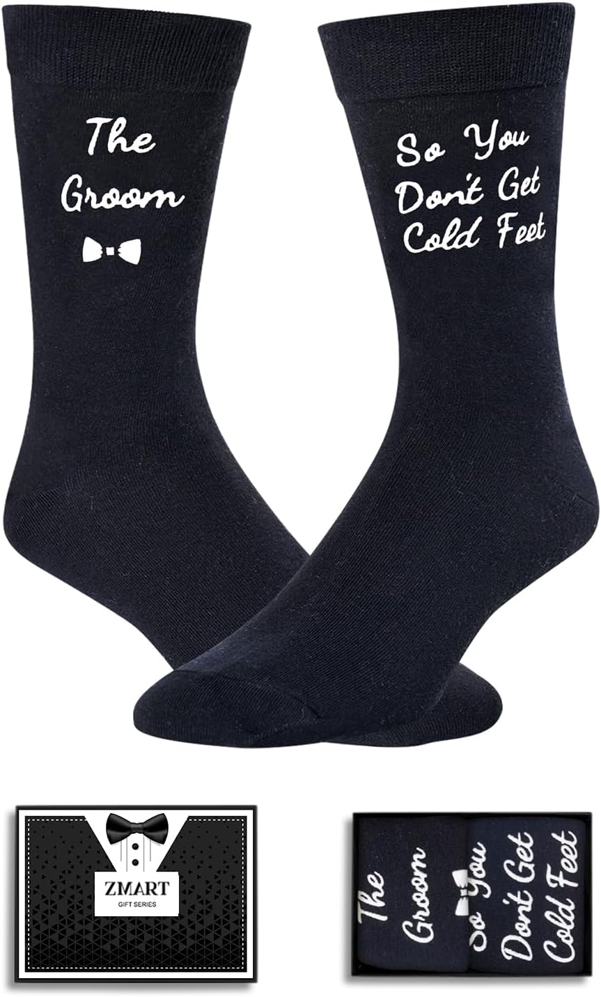 • GROOM SOCKS: These black funny wedding dress socks have the saying “SO YOU DON’T GET COLD FEET THE GROOM” inscribed on the side of this wedding socks.