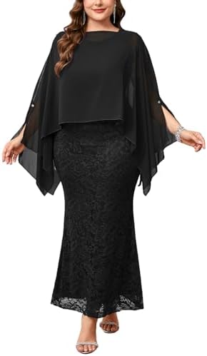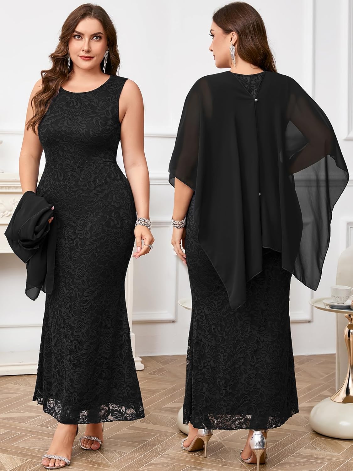 - 2 Piece Set: This lace mermaid gown pairs a lace tank maxi dress with a chiffon cape overlay and offers elegant wear. 1) Cape fully draped for graceful arm and tummy coverage, creating a smooth, slimming line. 2) The pleats fall longer over the arms; the extended folds soften and sculpt arm contours for a more refined look. 3) Slip arms through the cape’s discreet openings to showcase arm lines while the chiffon still flows for airy movement.