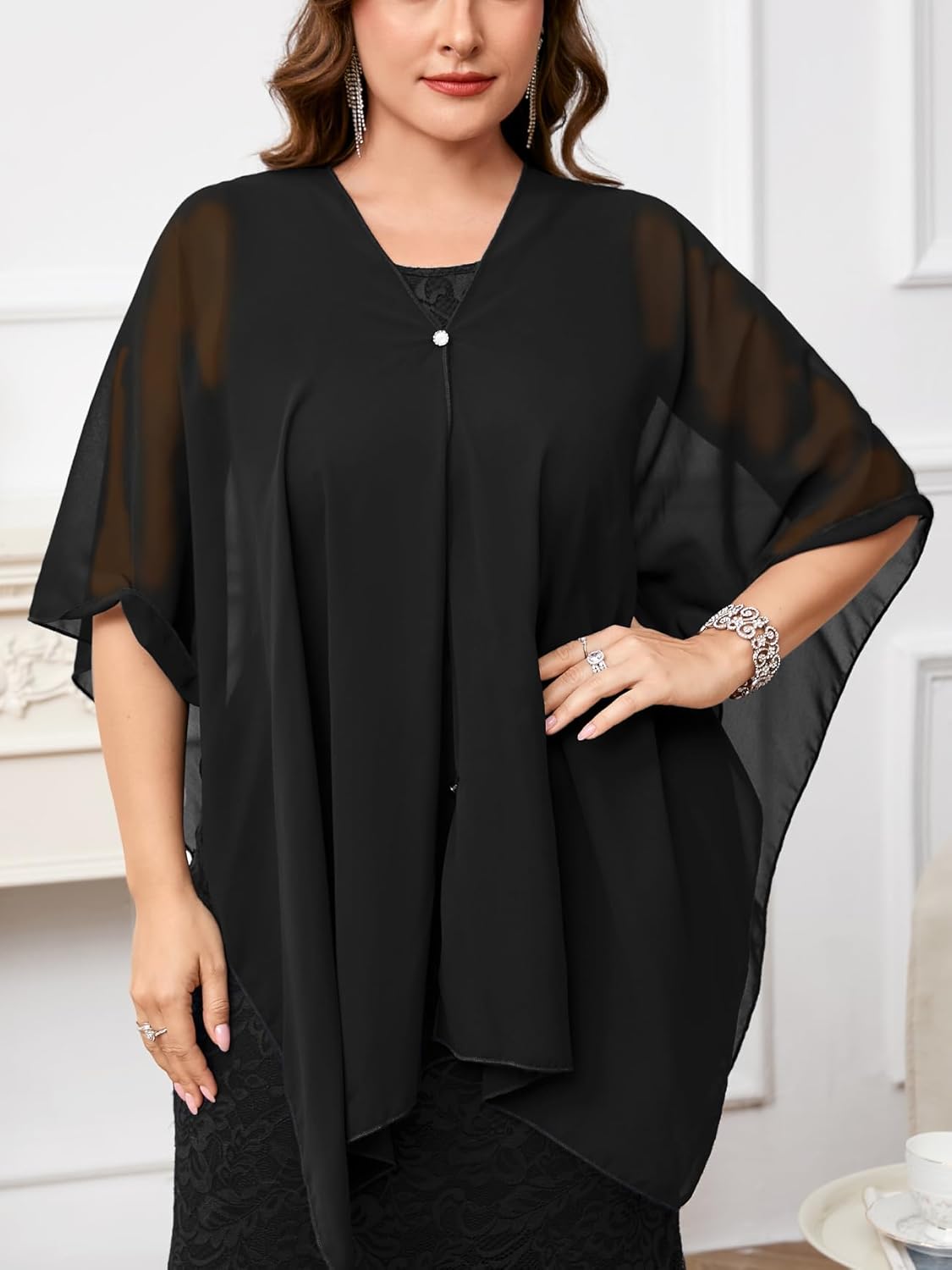 - Material: Crafted from luxurious elastic lace with a high-elastic, skin-friendly lining for comfort and shape retention. The chiffon cape overlay is lightweight, wrinkle-resistant, and flows gracefully, adding elegance and movement to your formal look.